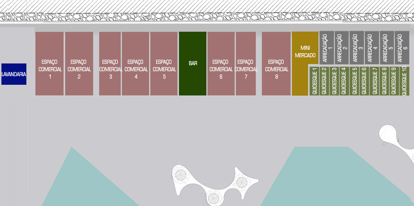Lavandaria Espaço Comercial 1 Espaço Comercial 2 Espaço Comercial 3 Espaço Comercial 4 Espaço Comercial 5 Bar 3 Espaço Comercial 6 Espaço Comercial 7 Espaço Comercial 8 Mini Mercado Quiosque 1 Quiosque 2 Quiosque 3 Quiosque 4 Quiosque 5 Quiosque 6 Quiosque 7 Quiosque 8 Quiosque 9 Quiosque 10 Arrecadação 1 Arrecadação 2 Arrecadação 3 Arrecadação 4 Arrecadação 5 Arrecadação 6